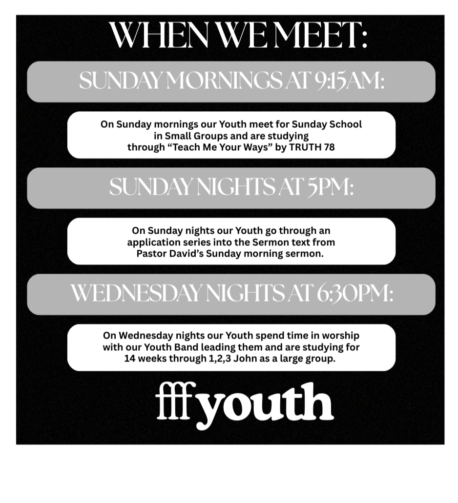 What We Are About: At Faith Family Fellowship Youth Ministry, we desire to see students grow into lifelong disciples of Jesus Christ. By God’s grace, we aim to cultivate students who:
